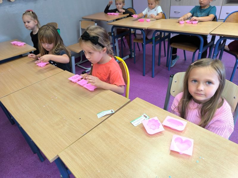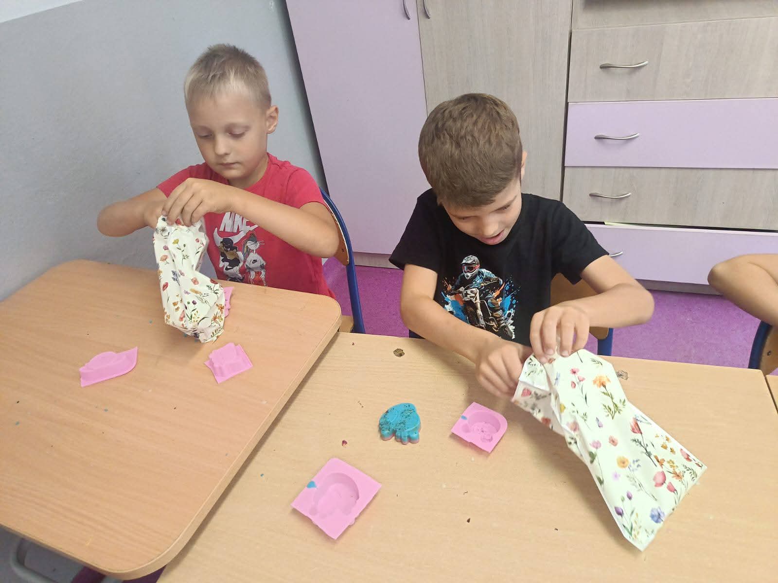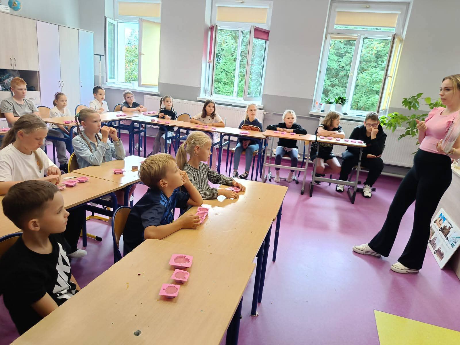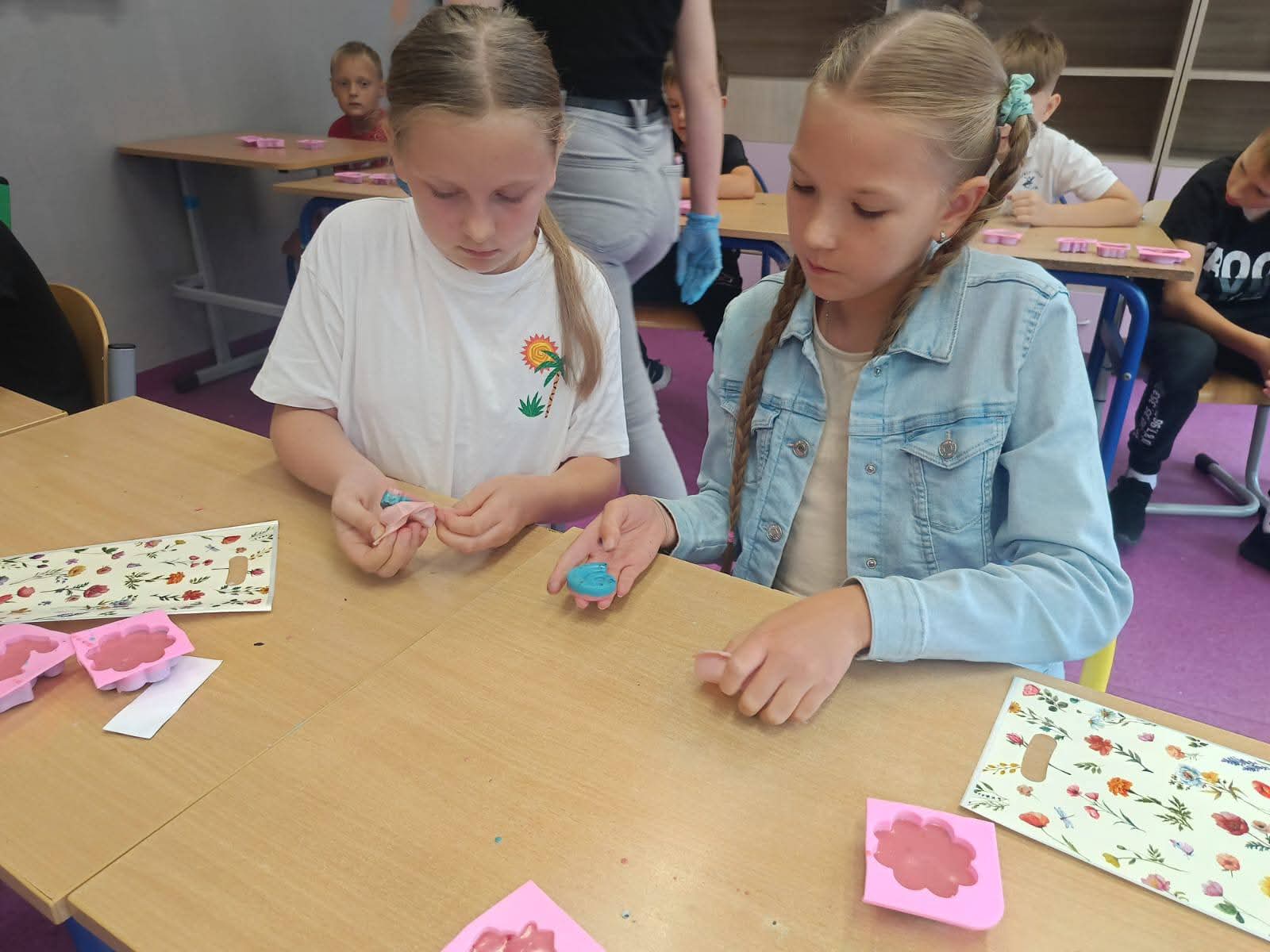 Dzieci pracowały z ogromnym zaangażowaniem, a w sali unosił się przyjemny aromat owocowych i kwiatowych esencji. Warsztaty dostarczyły nie tylko wiedzy praktycznej, ale także mnóstwa radości i twórczej zabawy. Największą satysfakcją dla uczestników było oglądanie efektów swojej pracy i możliwość zabrania własnoręcznie wykonanego mydełka do domu.