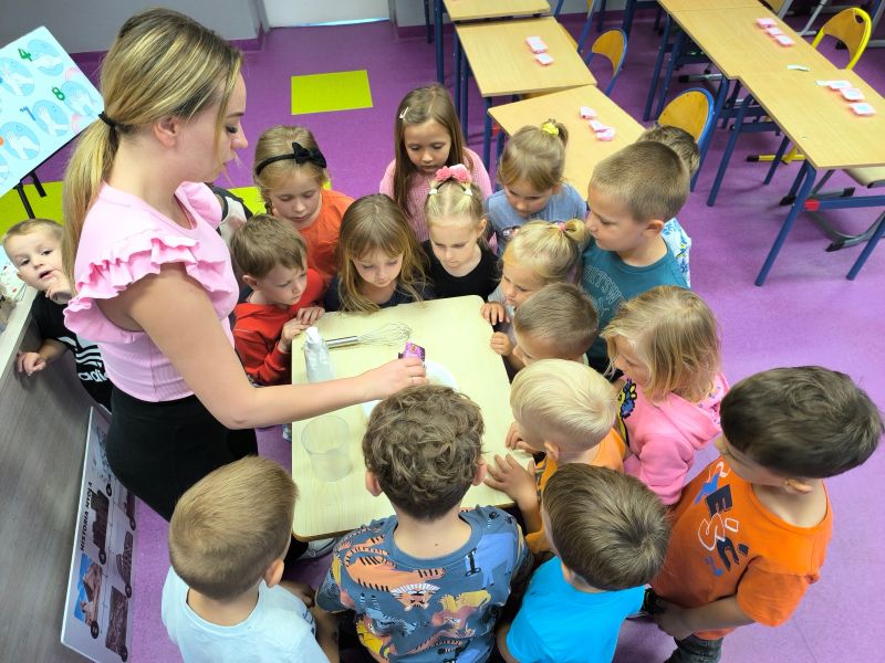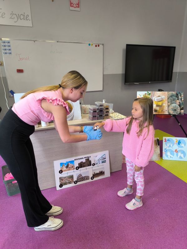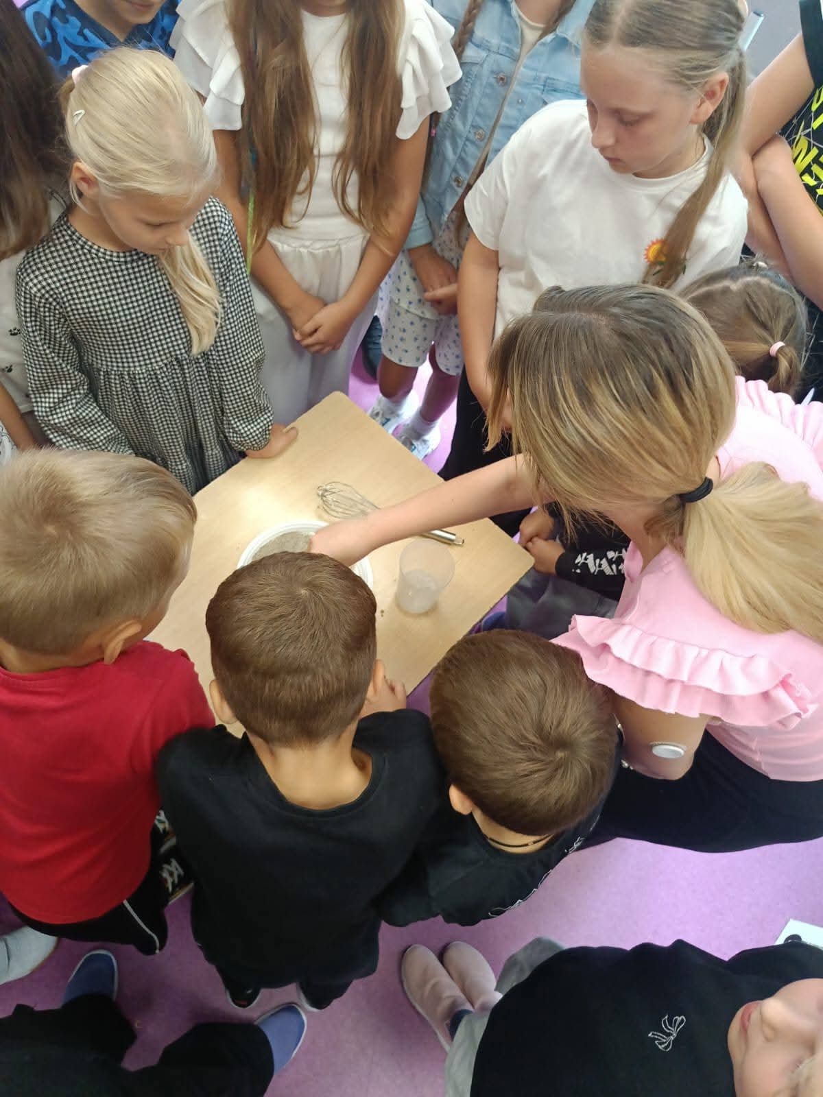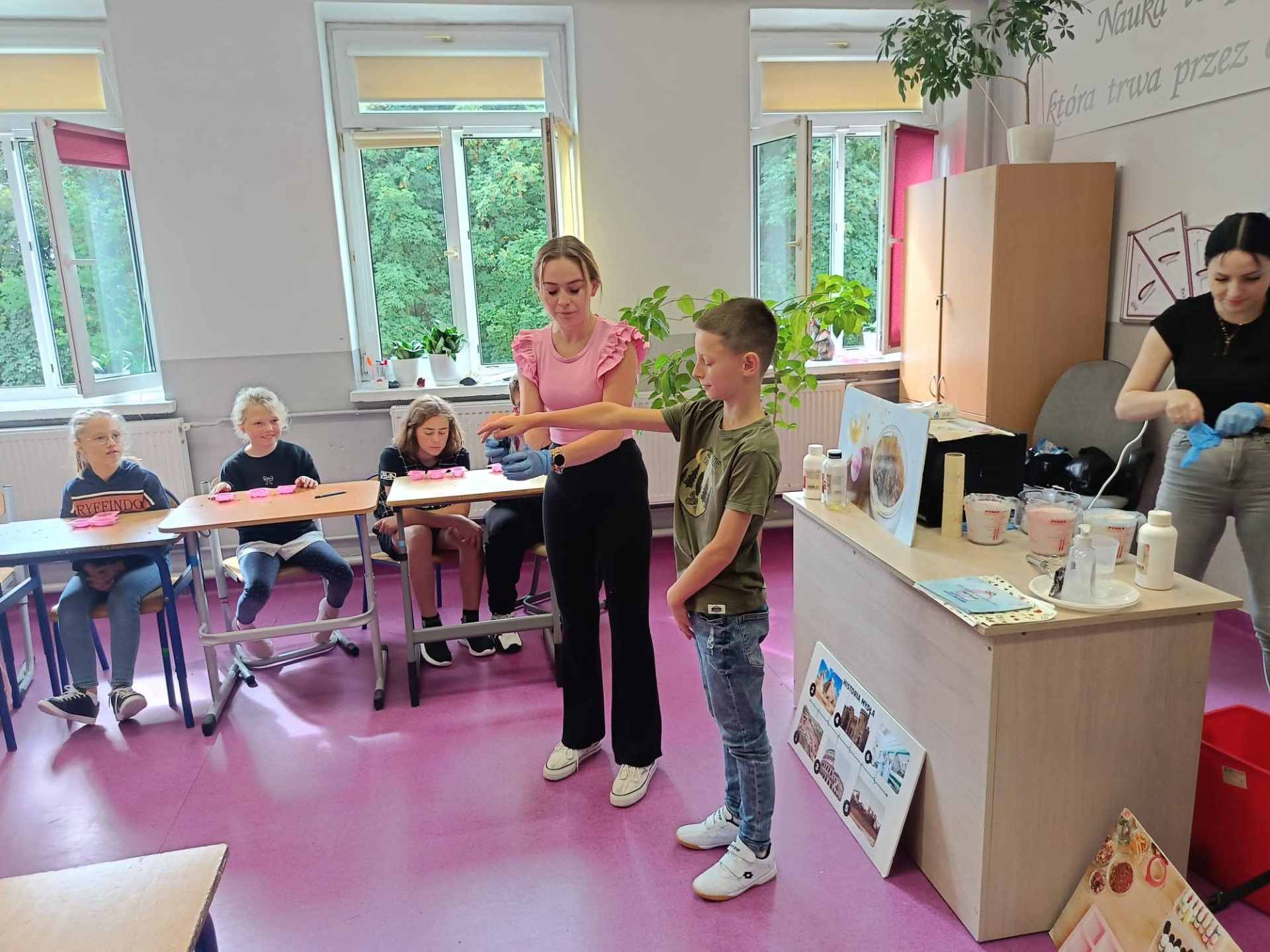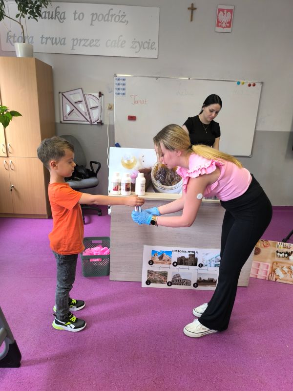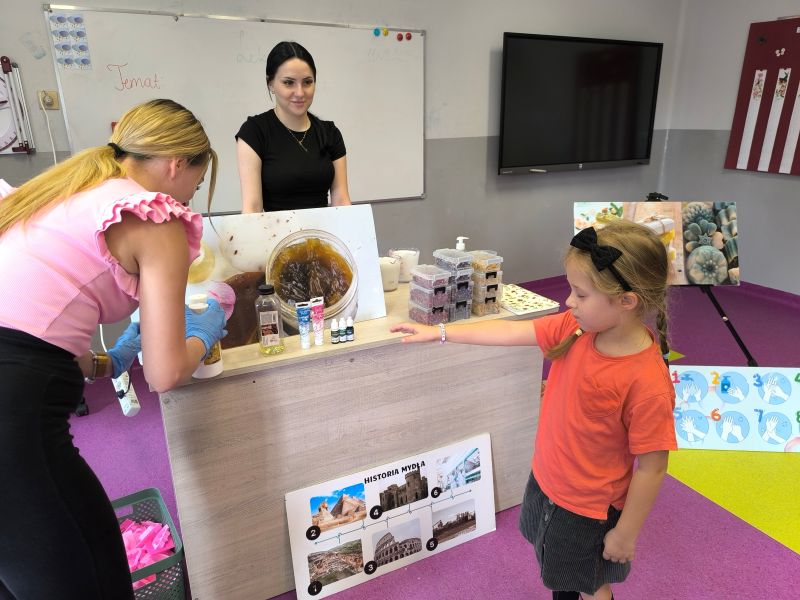 Dzieci pracowały z ogromnym zaangażowaniem, a w sali unosił się przyjemny aromat owocowych i kwiatowych esencji. Warsztaty dostarczyły nie tylko wiedzy praktycznej, ale także mnóstwa radości i twórczej zabawy. Największą satysfakcją dla uczestników było oglądanie efektów swojej pracy i możliwość zabrania własnoręcznie wykonanego mydełka do domu.