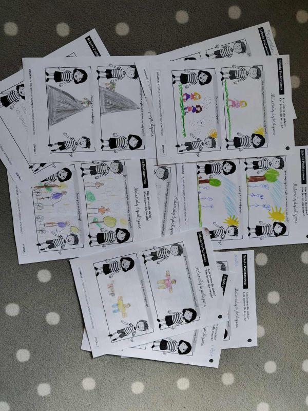 Wychowankowie przedszkola również wzięli udział poprzez zajęcia z pedagogiem, które miały na celu realizację scenariusza w którym poznali sposoby reagowania i radzenia sobie oraz pomagania innym w trudnych sytuacjach. Zdobyli też wiedzę w jaki sposób określać swoje emocje oraz jak właściwie je nazywać i rozpoznawać u innych ludzi.