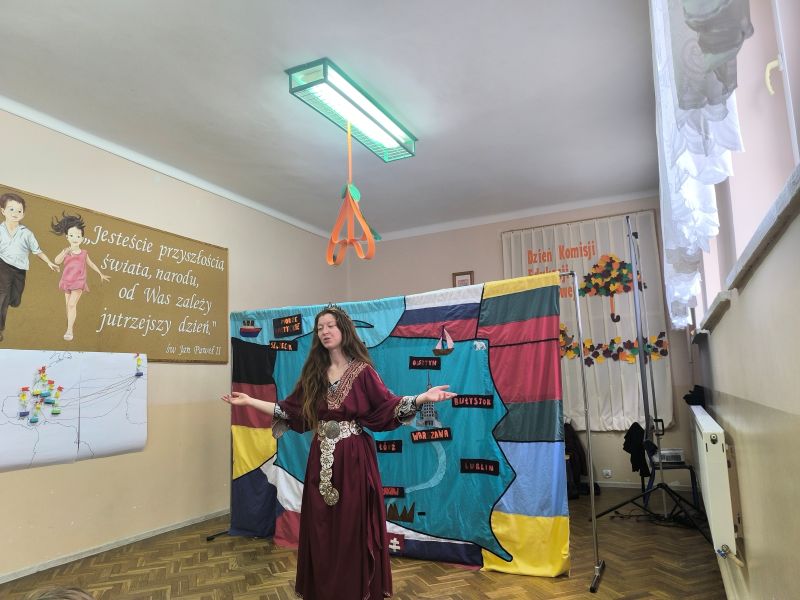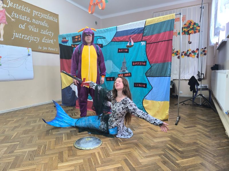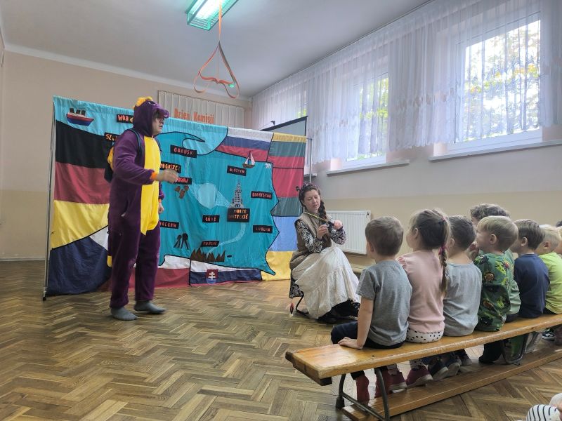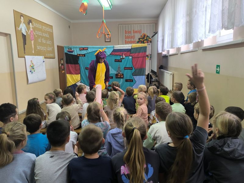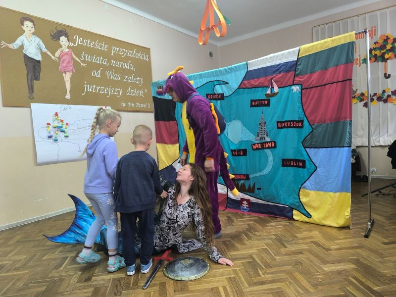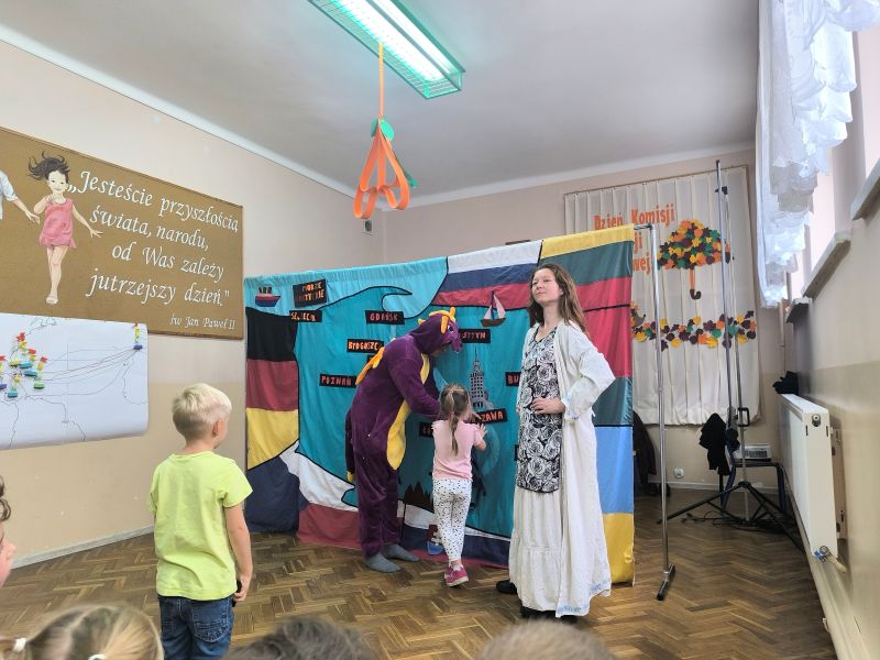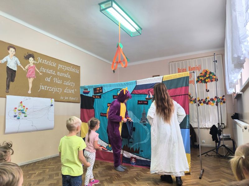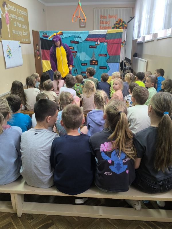 Dziś w naszej szkole gościło Studio Artystyczne "Akada" z Warszawy. Artyści zaprezentowali uczniom przedstawienie pt. „Po Polsce. Podróże małe i duże”. Spektakl był ciekawą i pełną humoru opowieścią o podróżach po różnych regionach naszego kraju. Dzieci z zainteresowaniem oglądały występ, poznając jednocześnie polskie tradycje, zwyczaje i miejsca warte odwiedzenia.