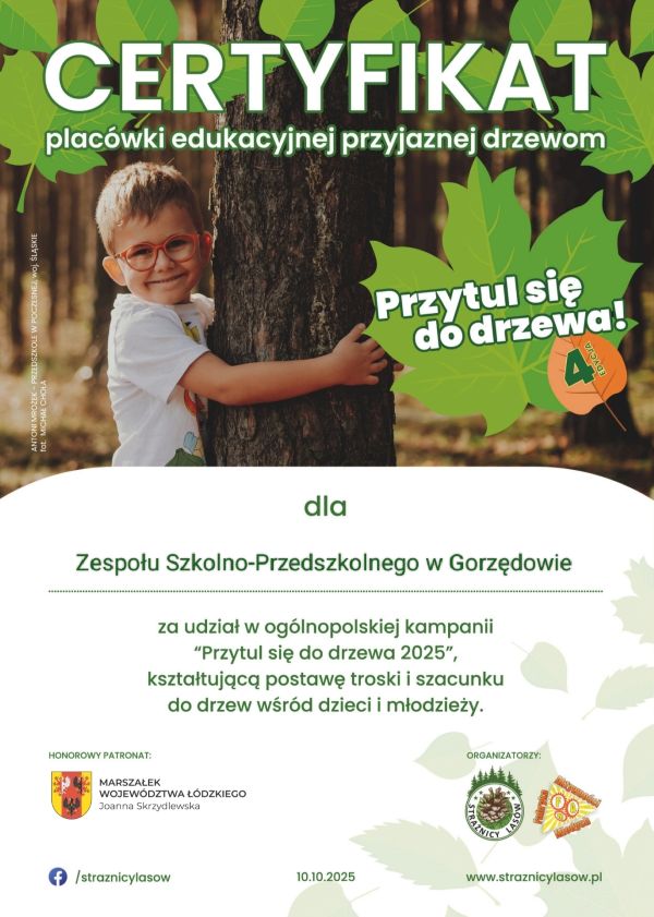 🌳💚 Z radością informujemy, że wzięliśmy udział w ogólnopolskiej kampanii „Przytul się do drzewa”. Otrzymaliśmy Certyfikat placówki edukacyjnej Przyjaznej Drzewom. 💚🌳 Warto nadmienić, że w tegorocznej akcji wzięły udział aż 2163 placówki edukacyjne z całej Polski! 💚