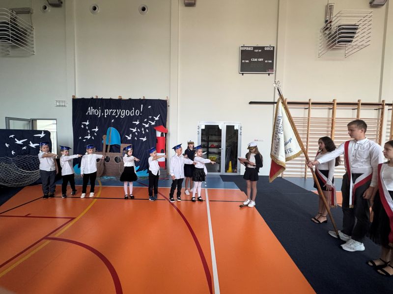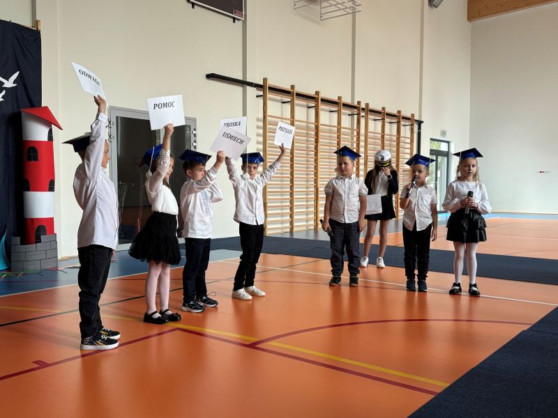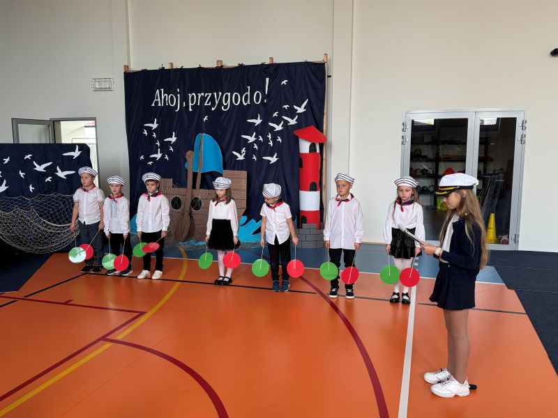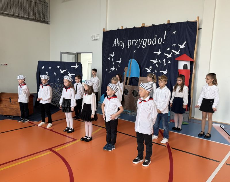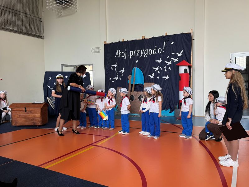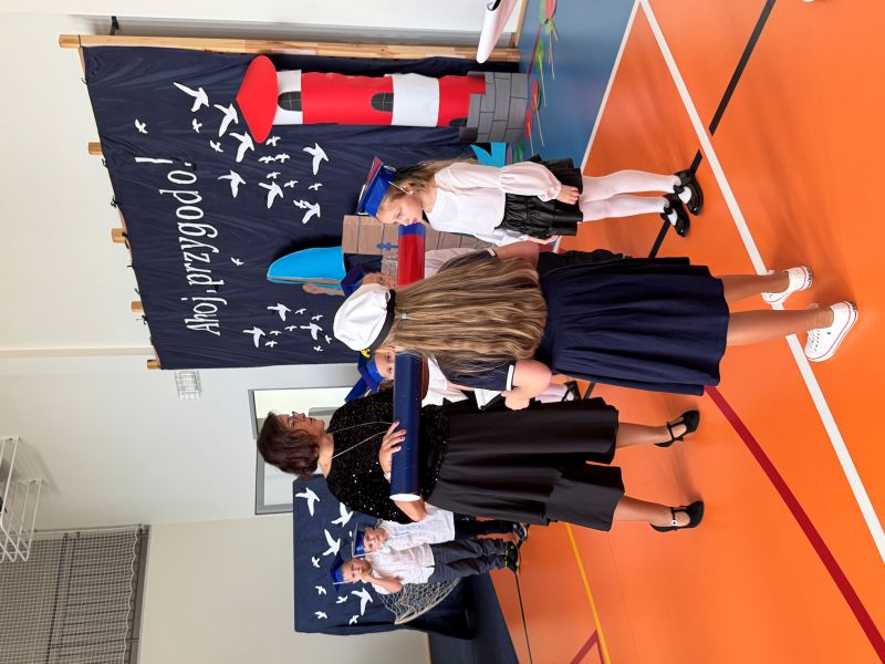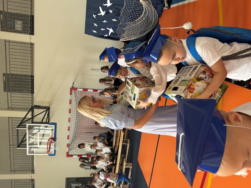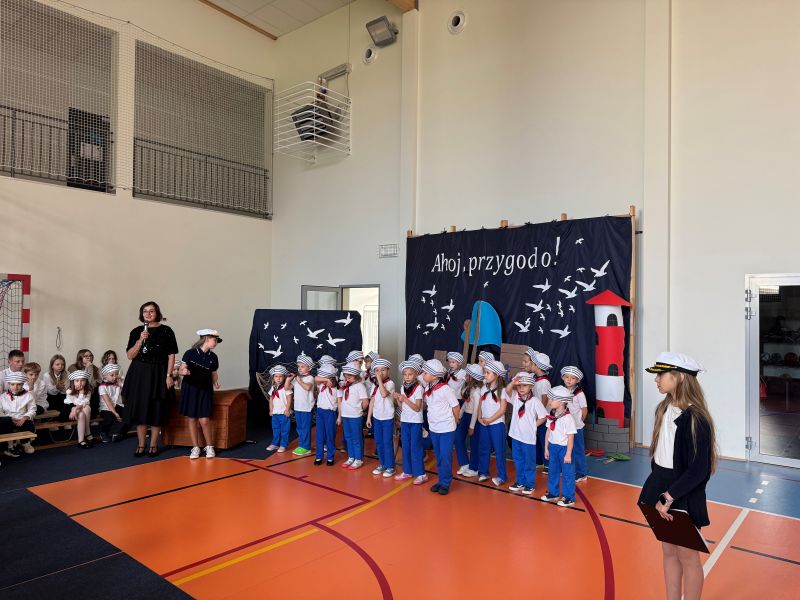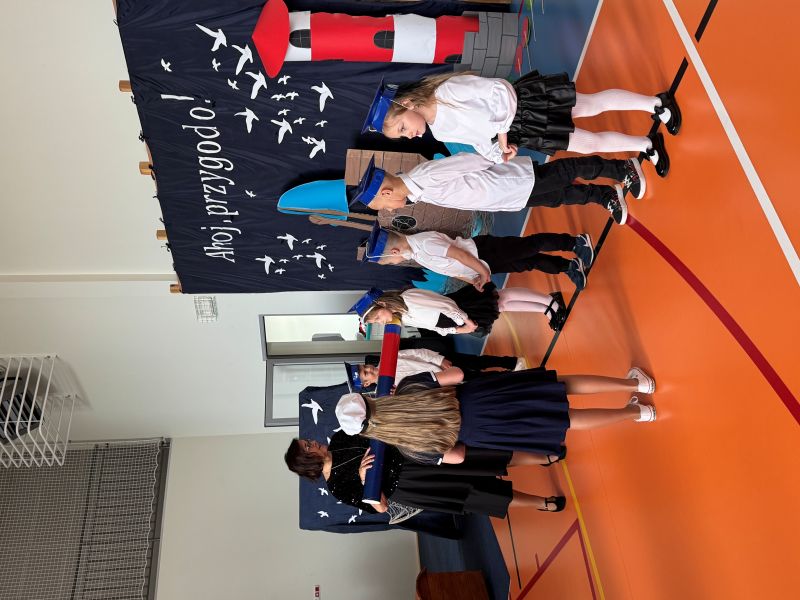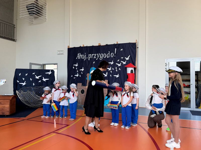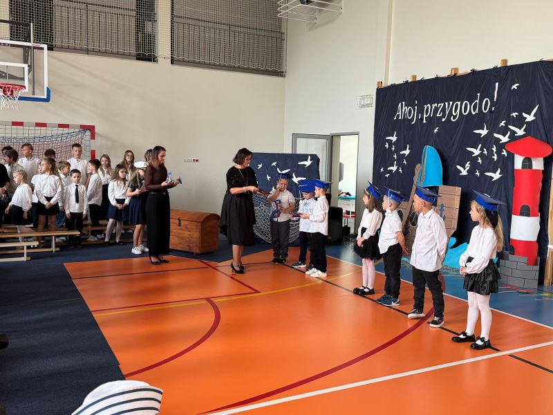 Tegoroczna akademia miała żeglarski motyw przewodni – najmłodsi zabrali nas w niezwykłą podróż po oceanie wiedzy i przygód. W barwnych strojach, z uśmiechem na twarzach, pięknie recytowali wiersze i śpiewali piosenki, zdobywając serca wszystkich obecnych. Kulminacyjnym momentem uroczystości było uroczyste ślubowanie uczniów klasy pierwszej oraz pasowanie na przedszkolaka, którego dokonała Pani Dyrektor. Po oficjalnej części dzieci zostały obdarowane upominkami od zaproszonych gości, Pani Dyrektor oraz starszych kolegów i koleżanek z klasy drugiej i trzeciej. Było wiele radości, uśmiechów i serdecznych gratulacji.