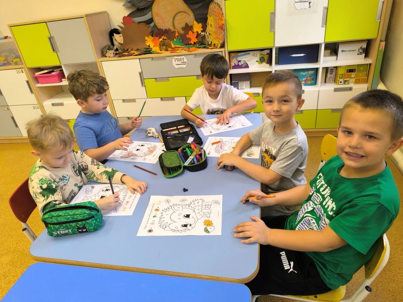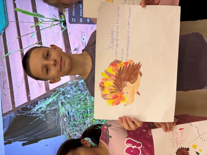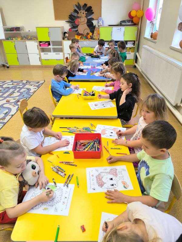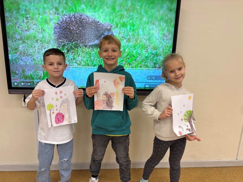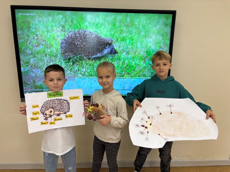Dziś w naszym przedszkolu świętowaliśmy wyjątkowy dzień – Dzień Jeża!🦔🦔 Od rana w sali panowała radosna, jesienna atmosfera, a dzieci z ciekawością odkrywały tajemnice tego małego, kolczastego zwierzątka. Poznaliśmy jego budowę, zwyczaje i sposoby, w jakie przygotowuje się do zimowego snu. Nie zabrakło też zabaw ruchowych, quizów i gier tematycznych, które wywołały mnóstwo uśmiechów. Wspólnie obejrzeliśmy film edukacyjny o życiu jeża, a potem przedszkolaki z zapałem malowały jego postać – każdy jeż wyglądał inaczej i był naprawdę wyjątkowy! Tego dnia odwiedzili nas również uczniowie z klasy drugiej i trzeciej. W języku angielskim przedstawili budowę jeża i opowiedzieli o jego ciekawych zwyczajach, co bardzo zainteresowało najmłodszych. Dzieci słuchały z uwagą i chętnie zadawały pytania. Na zakończenie dnia wszyscy zgodnie stwierdzili, że jeż to niezwykle pożyteczne zwierzątko, które pomaga ludziom i przyrodzie. Dlatego musimy o niego dbać i pamiętać, by zawsze był bezpieczny w swoim naturalnym środowisku.🦔