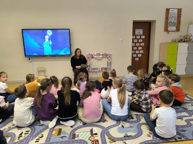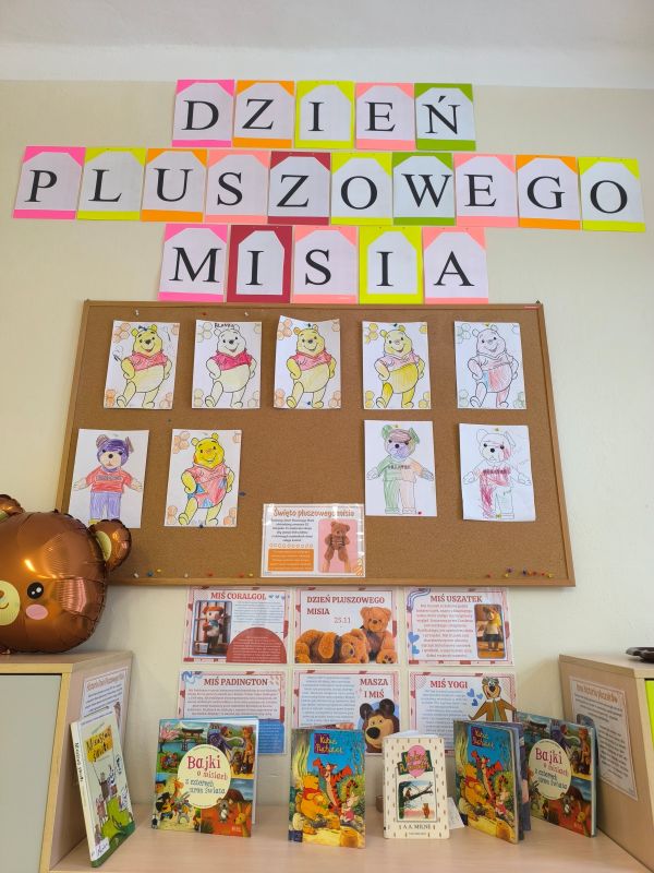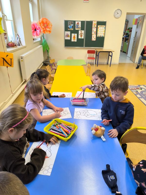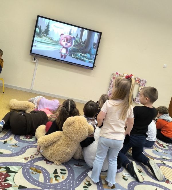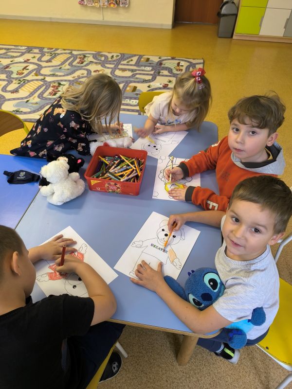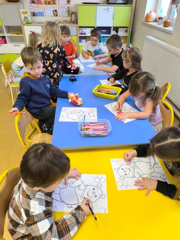 Przedszkolaki obejrzały krótką historię powstania pluszowego misia, poznając ciekawostki dotyczące tego wyjątkowego święta. Następnie uczestniczyły w zajęciach plastycznych, podczas których kolorowały postać misia – każda praca była inna i odzwierciedlała dziecięcą wyobraźnię.