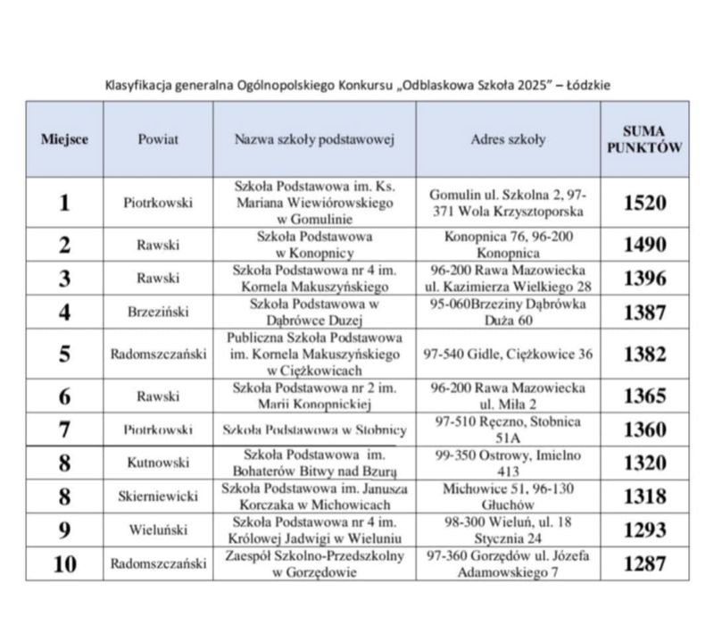Z radością informujemy, że nasza placówka szkolna zdobyła 10 miejsce na 72 szkoły województwa łódzkiego biorące udział w ogólnopolskim konkursie "Odblaskowa Szkoła 2025".