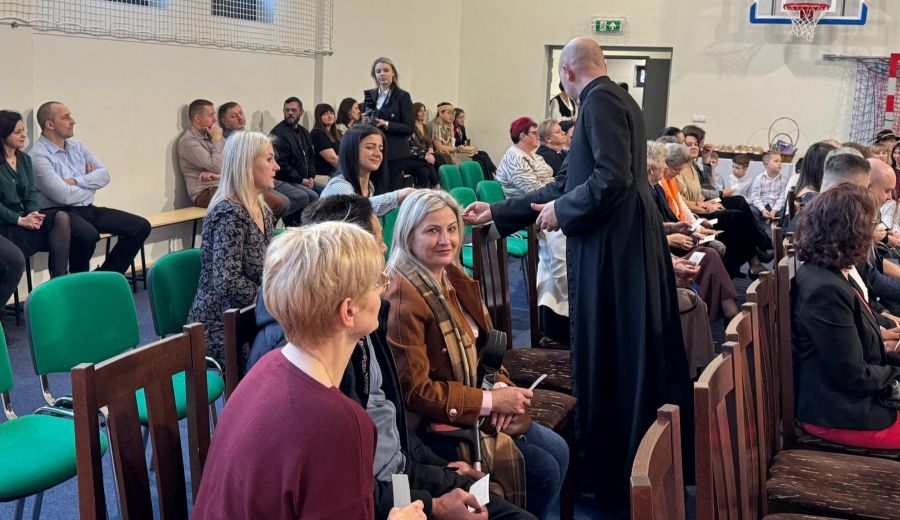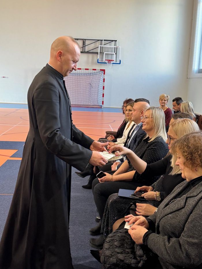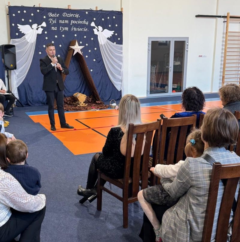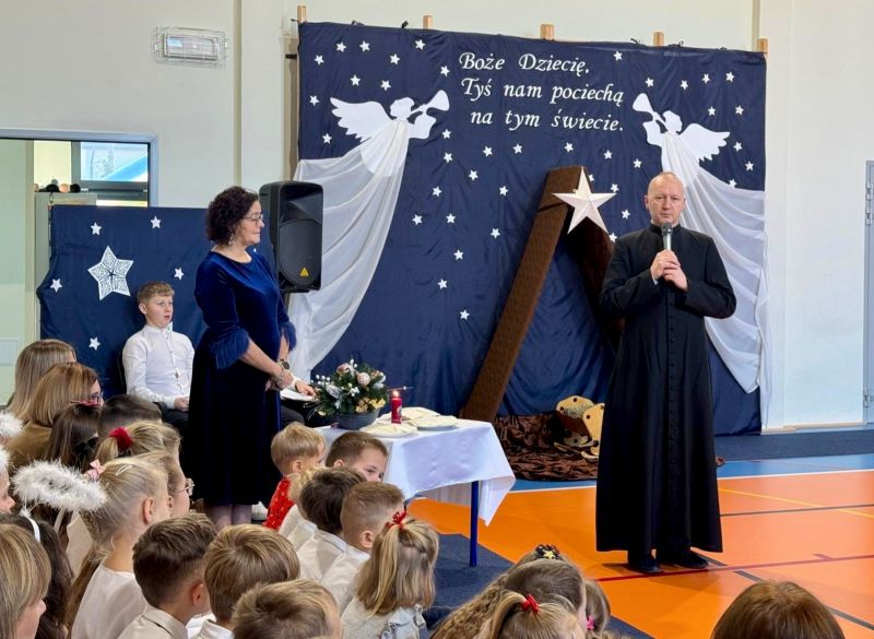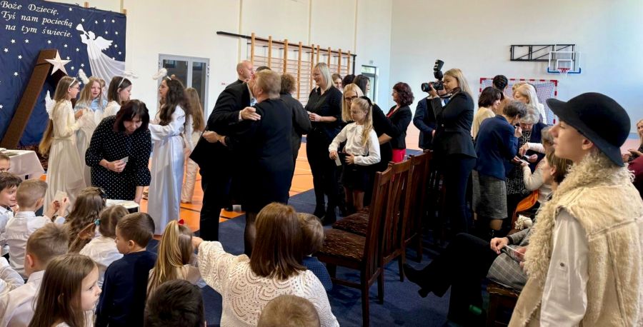 Uroczystość rozpoczęła Pani Dyrektor Agata Justyna Rozpończyk, która w swoim przemówieniu wyraziła radość ze wspólnego spotkania, następnie Ksiądz Paweł Bil przypomniał najważniejsze przesłanie Świąt Bożego Narodzenia. 🎀 W dalszej kolejności Pani Dyrektor zaprosiła uczniów, pracowników i gości do jednej z najmilszych chwil – łamania się opłatkiem i składania świątecznych życzeń. 🤗