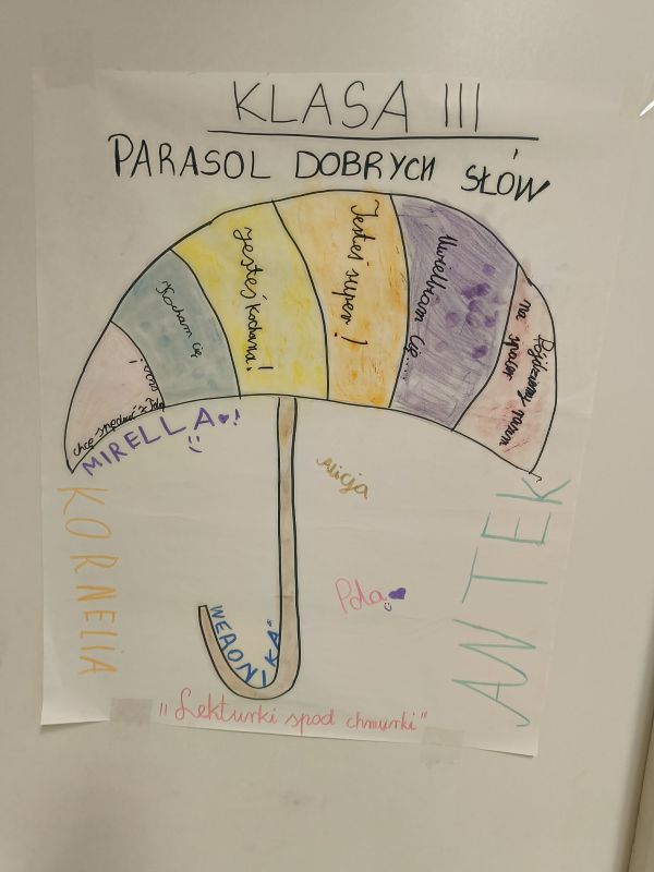 Lekturki spod chmurki, to projekt edukacyjny, w którym od początku października biorą udział klasy I-III. Zakłada on zapoznanie dzieci z literaturą dziecięcą w angażujący, kreatywny sposób. Poprzez zadania plastyczno-techniczne i różnego rodzaju aktywności dzieci rozwijały pasję czytelniczą i poznawały historie związane z lekturą. Klasa I pracowała z książką Waldemara Cichonia „Cukierku, Ty Łobuzie”, klasa II omawiała książkę „Doktor Dolittle i jego zwierzęta”, autorstwa Hugh Loftinga, a klasa III klasykę literatury dziecięcej czyli „Dzieci z Bullerbyn” Astrid Lindgren. Podczas realizacji projektu uczniowie założyli i na bieżąco uzupełniali swoje lekturniki, stworzyli pudełka z lekturą, do których schowali największe skarby związane z bohaterami książek, wykonali grę planszową, wystawili teatrzyk cieni. Powstał też parasol dobrych słów i mapa przyjaźni. Mamy nadzieję, że zadania i aktywności, jakie podjęli nasi mali czytelnicy pomogą im chętniej sięgać po kolejne pozycje z literatury dziecięcej. Przed nimi niesamowite przygody, bowiem realizacja drugiego modułu projektu pt.: „Mimo deszczu jesteśmy razem”, jest już w toku.